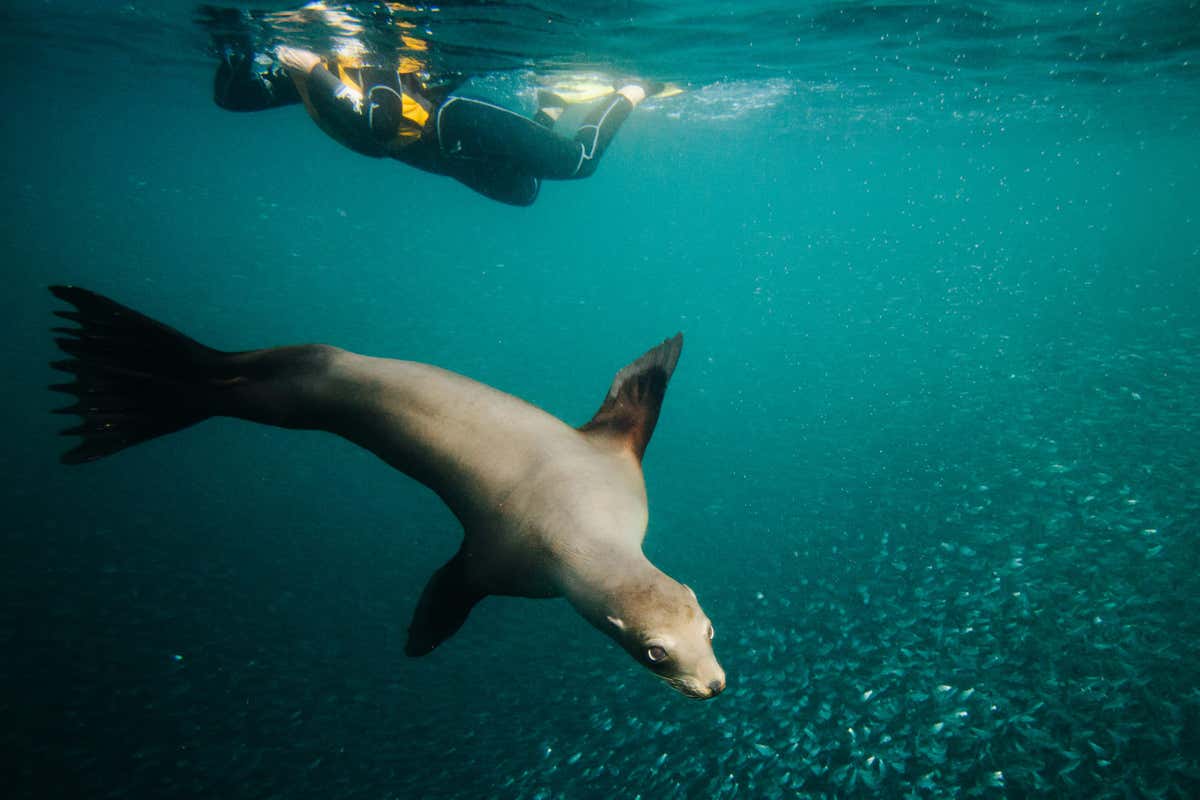 Los Islotes, a small cluster of rocky islets off the coast of Baja California Sur, is famous for its friendly colony of California sea lions. These curious pups are familiar with humans and will joyfully swim alongside you and your fellow cruisers. You will arrive bright and early before the other tour boats, ensuring you can enjoy this activity crowd-free. Above water, the dramatic cliffs provide a striking backdrop, often visited by seabirds like blue-footed boobies and frigates. Opportunities for skiff tours will also be available. Whether you are swimming with sea lions or marveling at the vibrant ecosystem, Los Islotes offers an unforgettable encounter with the wild beauty of the Sea of Cortez.