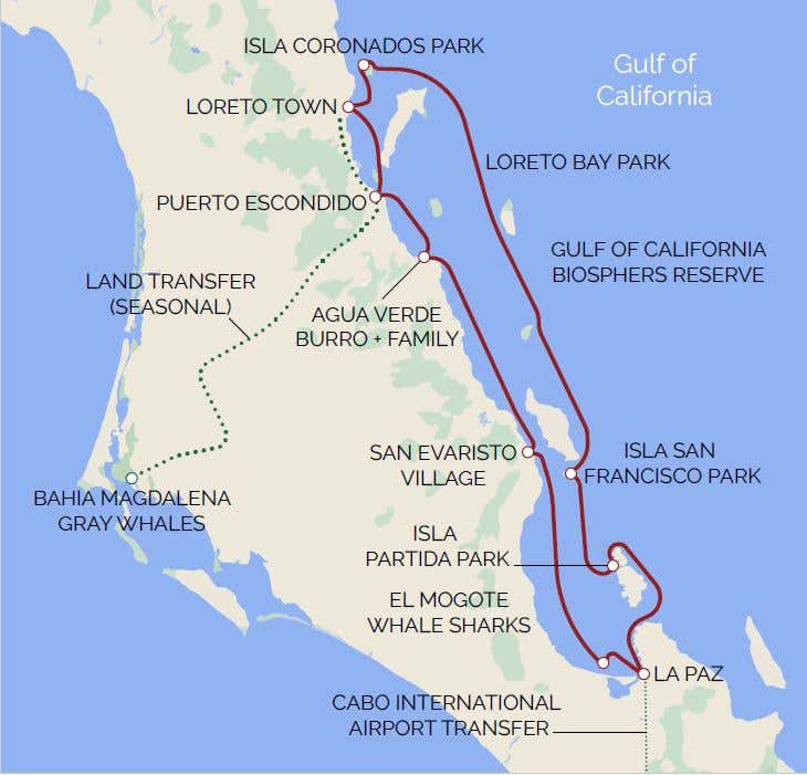 Departing from La Paz, cruise aboard the luxurious Safari Voyager, navigate along dramatic coastlines, pristine white-sand beaches and the sparkling turquoise waters of the Sea of Cortez. Immerse yourself in a variety of unforgettable experiences, from hiking rugged volcanic trails and exploring hidden coves to embarking on mule rides led by local rancheros in the picturesque Bahía Agua Verde. Each day offers new adventures, stunning vistas and opportunities to connect with the heart of Baja California’s unparalleled beauty and culture.