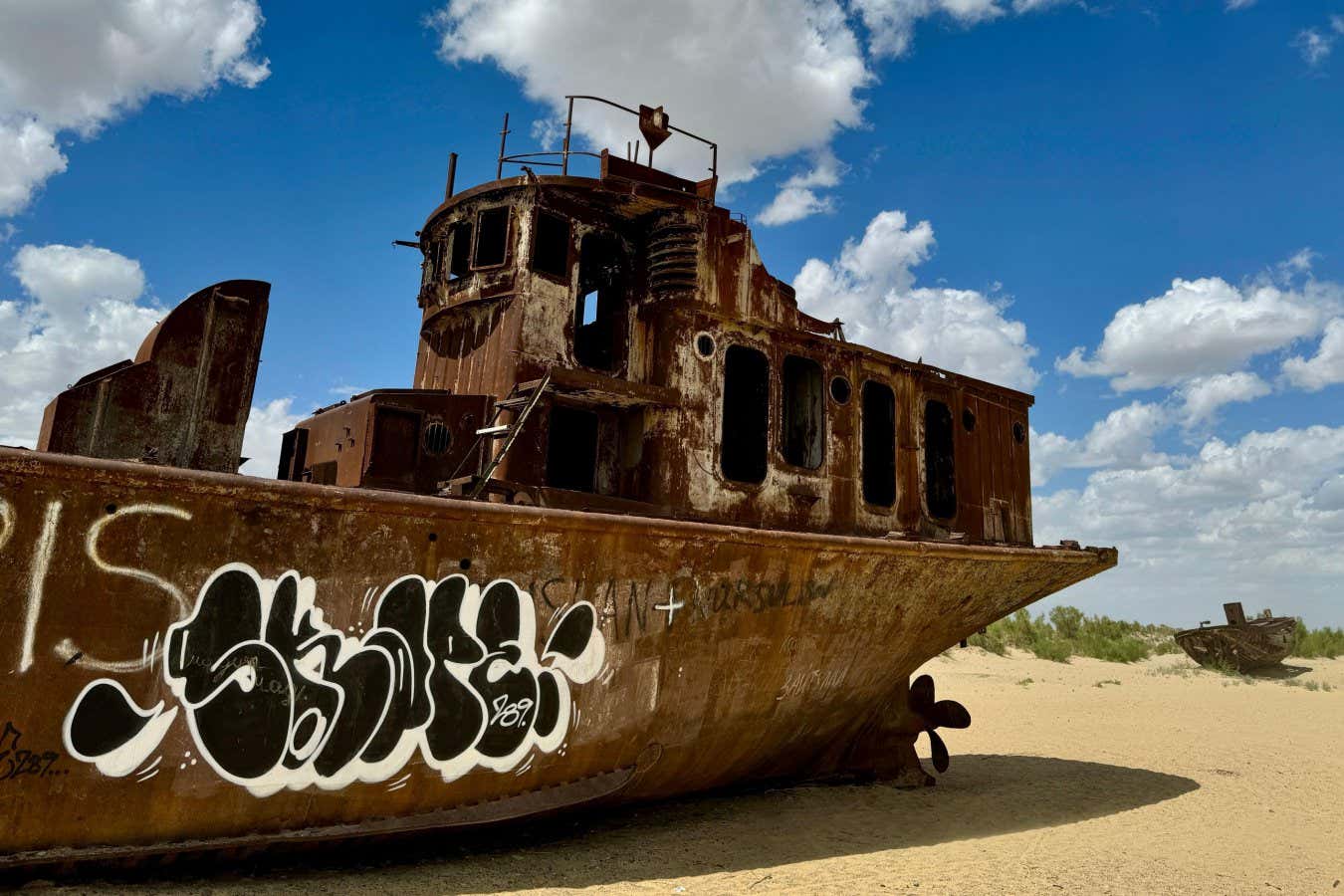 A ship graveyard in the Aral Sea desert, Uzbekistan S@OwwL / Alamy